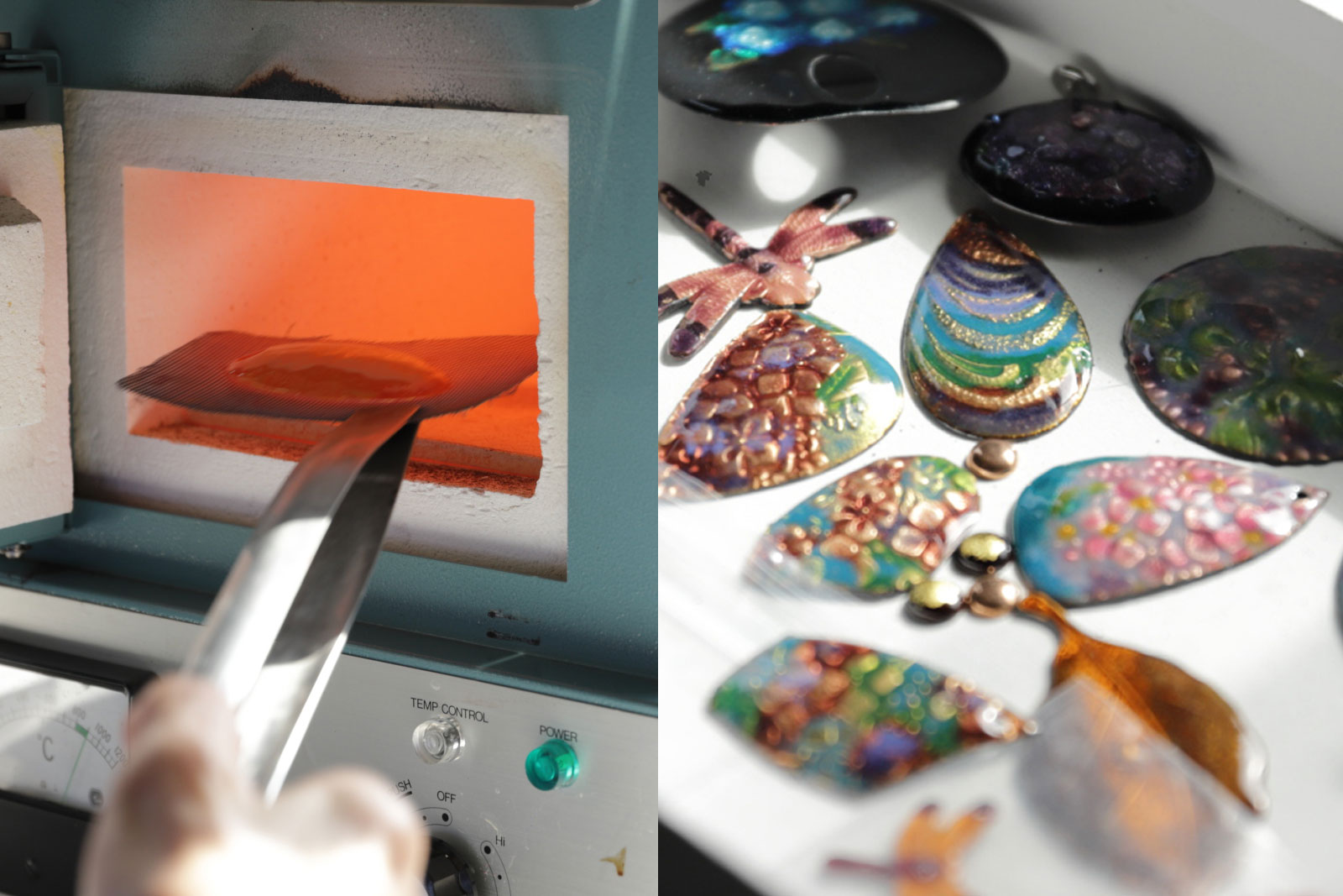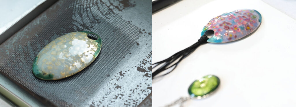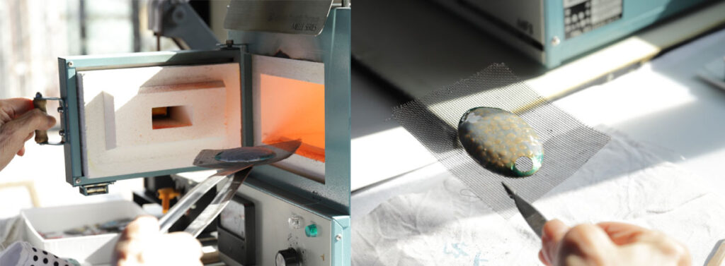 釉薬をのせ終わって、いよいよ焼成です。窯の温度はおよそ800℃!夏の作業では汗だくになるそうです。焼きながら何度か窯の扉を開け、状態を確かめて取り出します。 最初は、銅板にのせた釉薬が熱に反応して暗い感じの色で「あれっ?」と首を傾げてしまいますが、やがて冷えると鮮やかな本来の色が現れ、ほっと胸を撫で下ろすのです。