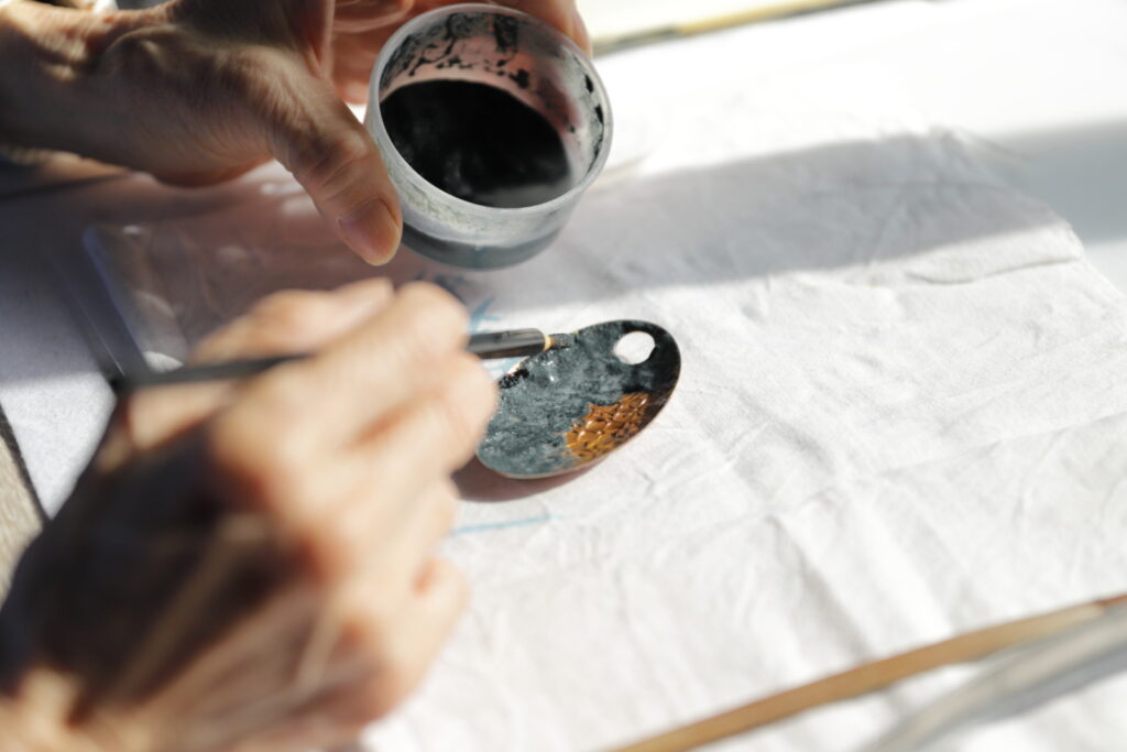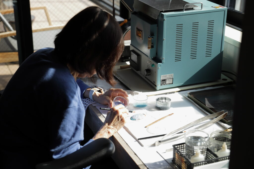 最近新築したという住居の中にあるアトリエは、何よりも作業効率を重視して設計したそうです。自然光がちょうど当たる作家の手元を、じっくりと見せていただくことができました。
