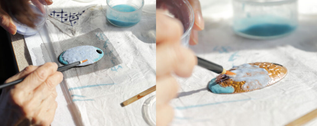 【素地の銅板に、慎重に釉薬をのせていく】