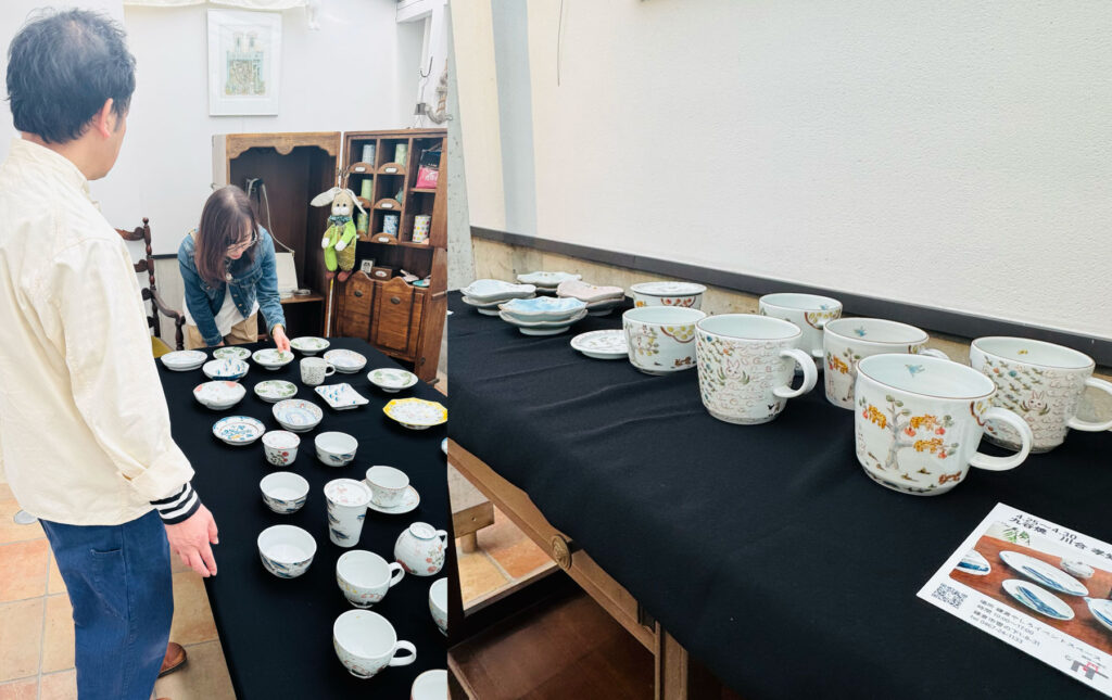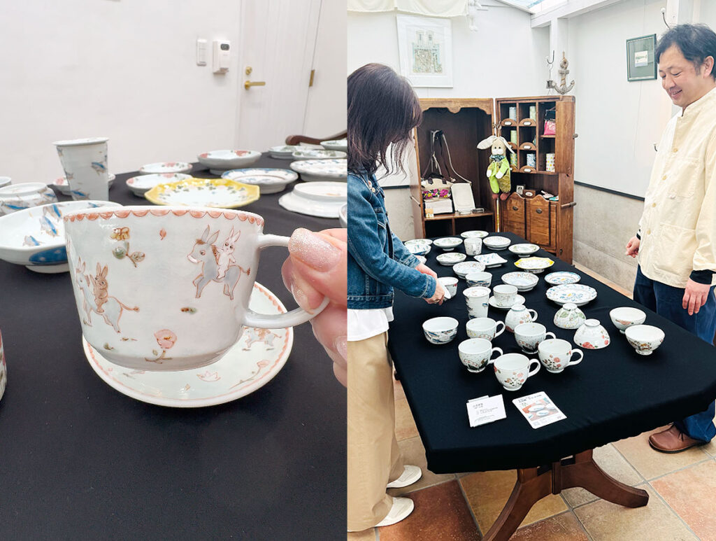 その後も途切れることなくお客様が続き、会場は一日を通して大変な賑わいに。皆様、絵巻物語のような絵付けに魅了され、器を手に取りながら細やかな描写を見つけては、思わず感嘆の声を上げていらっしゃいました。