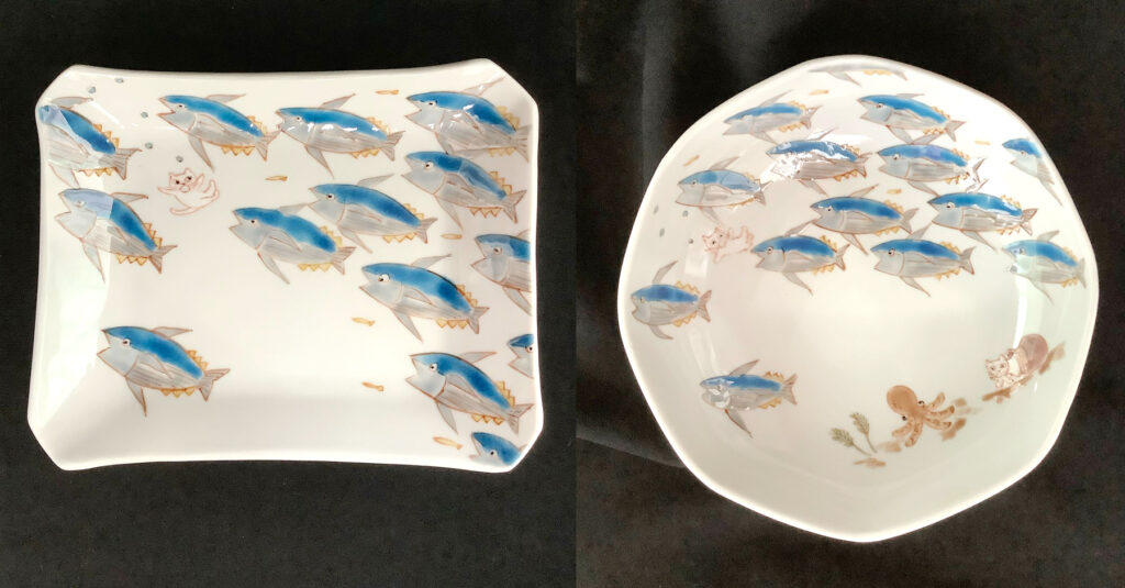 これからの季節にもぴったりな、涼しげなお魚のプレート。どちらの形が良いかしらと、じっと眺めてみると……
