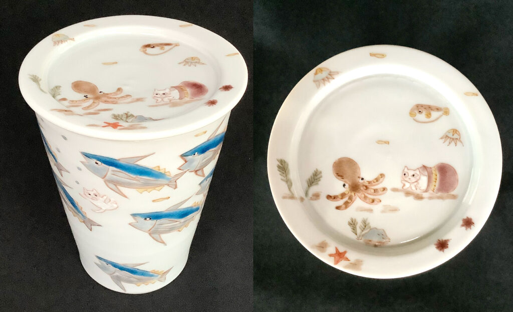 魚のシリーズには、蓋付きタンブラーもございます。海に放り出されて慌てている猫ちゃんと、対照的に、蛸壺(たこつぼ)を乗っ取って我が物顔の猫ちゃん。