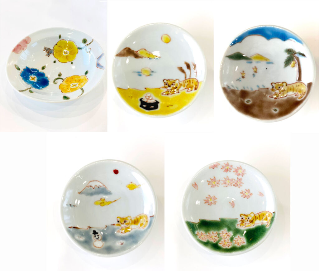 川合氏に毎年制作いただいている、鎌倉やしろオリジナル『干支の四季シリーズ まめ豆皿』は、干支の新作を心待ちにしてくださるお客様に、大変ご好評をいただいております。上段一番左端は、『ヘリ付きネコと花 丸皿』です。
